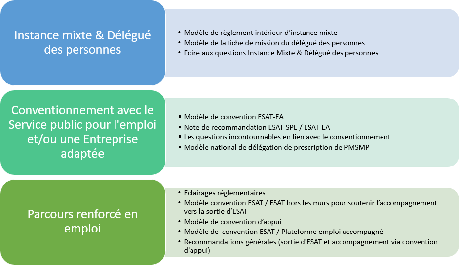 Des groupes de travail composés de professionnels en ESAT ont travaillé à l’élaboration d’un kit outil portant sur les thématiques suivantes : Instance Mixte et Délégué des personnes, Parcours renforcé en emploi et conventionnement.