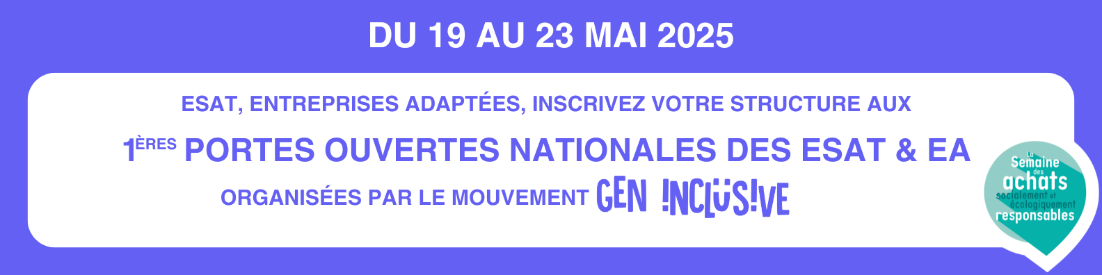 Le mouvement Gen'Inclusive organise les premières Portes Ouvertes nationales des ESAT & EA du 19 au 23 mai 2025 : inscrivez votre structure à l’agenda !Lancé à l'initiative d'Hosmoz et porté par un collectif d'associations et d'entreprises, le mouvement Gen'Inclusive a mené en 2024 une campagne de communication digitale nationale visant à faire rayonner les ESAT-EA, suscitant près de 30 millions de vues et 122 millions d’interactions. En 2025, le mouvement va plus loin et se déploie sur les territoires en créant une opération inédite : les « Portes Ouvertes nationales des ESAT & EA » organisées du 19 au 23 mai 2025 en partenariat avec ESS-France dans le cadre de la Semaine des Achats Socialement et Ecologiquement Responsables (SASER).